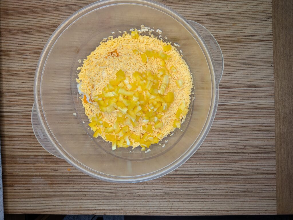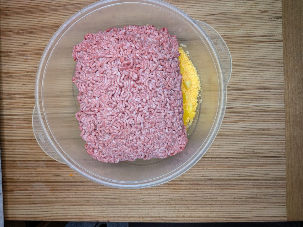- Add in the remaining ingredients (onion, bell pepper, carrot, cheese, and ground beef). Mix well.