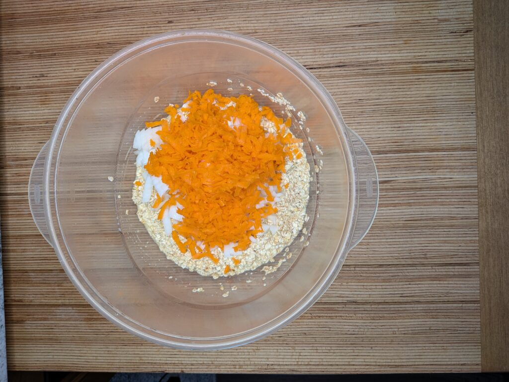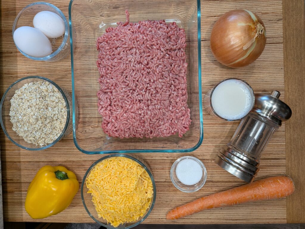 - In a large bowl, mix the milk, eggs and oatmeal. Once mixed add in the remaining ingredients (salt, pepper, carrot, onion, bell pepper, ground beef, cheese) Mix well.