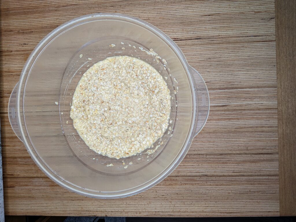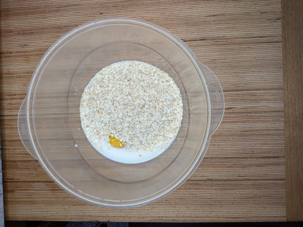 - In your large mixing bowl combine the quick oats, milk, salt, pepper, and eggs.